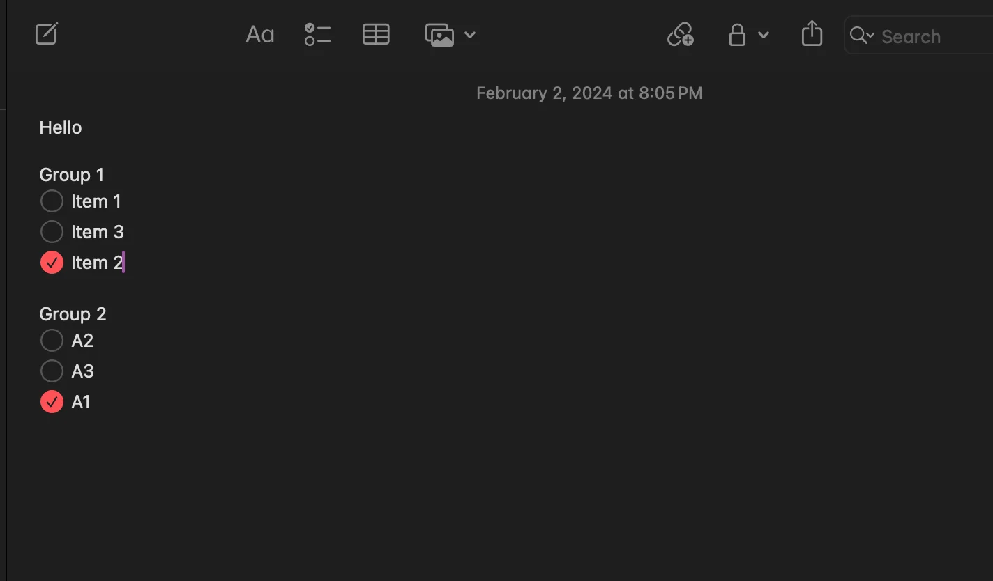 Checklist: You can self sort checklist in a group, such that the checked items move to the bottom of the group. This can be enabled using Automatically sort checked items option in the app settings. The good part about this is that you can separate these lists by just some text in between, allowing you to create “grouped” lists.