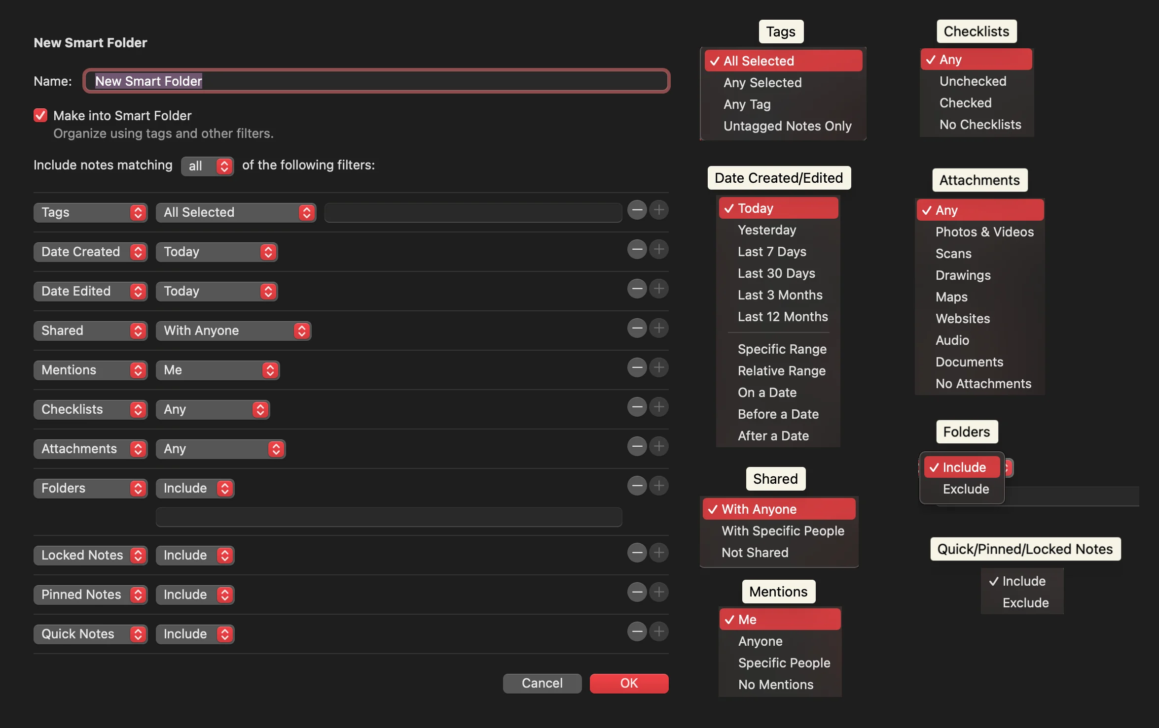 Smart Folders allow you to collect all notes based of either all or any based on a collection of rules. You can have 1 or no (but not multiple) rule from each category: Tags, Date Created, Date Edited, Shared, Mentions, Checklists, Attachments, Folders, Locked Notes, Pinned Notes and Quick Notes. The 1 or none constraint implies that you cannot do something like: Include notes matching any of the following filters: Attachments: Scans + Attachments: Maps.