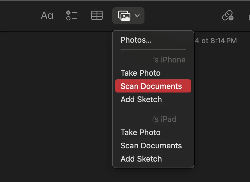 You can add a scanned document or a sketch to a Notes app that is open on your MacBook, through your iPhone or iPad.
