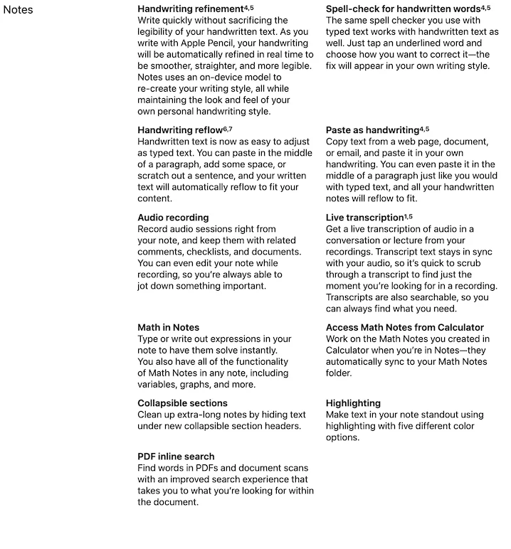 - Sep 24, 2024: Apple intelligence (here), highlight text (here), collapsible sections (here), improved PDF search (here), audio content (here), handwriting improvements (here), math notes (here). Fixed handwriting and live transcription device support to include models with A14 bionic (h/t u/ciappetti)