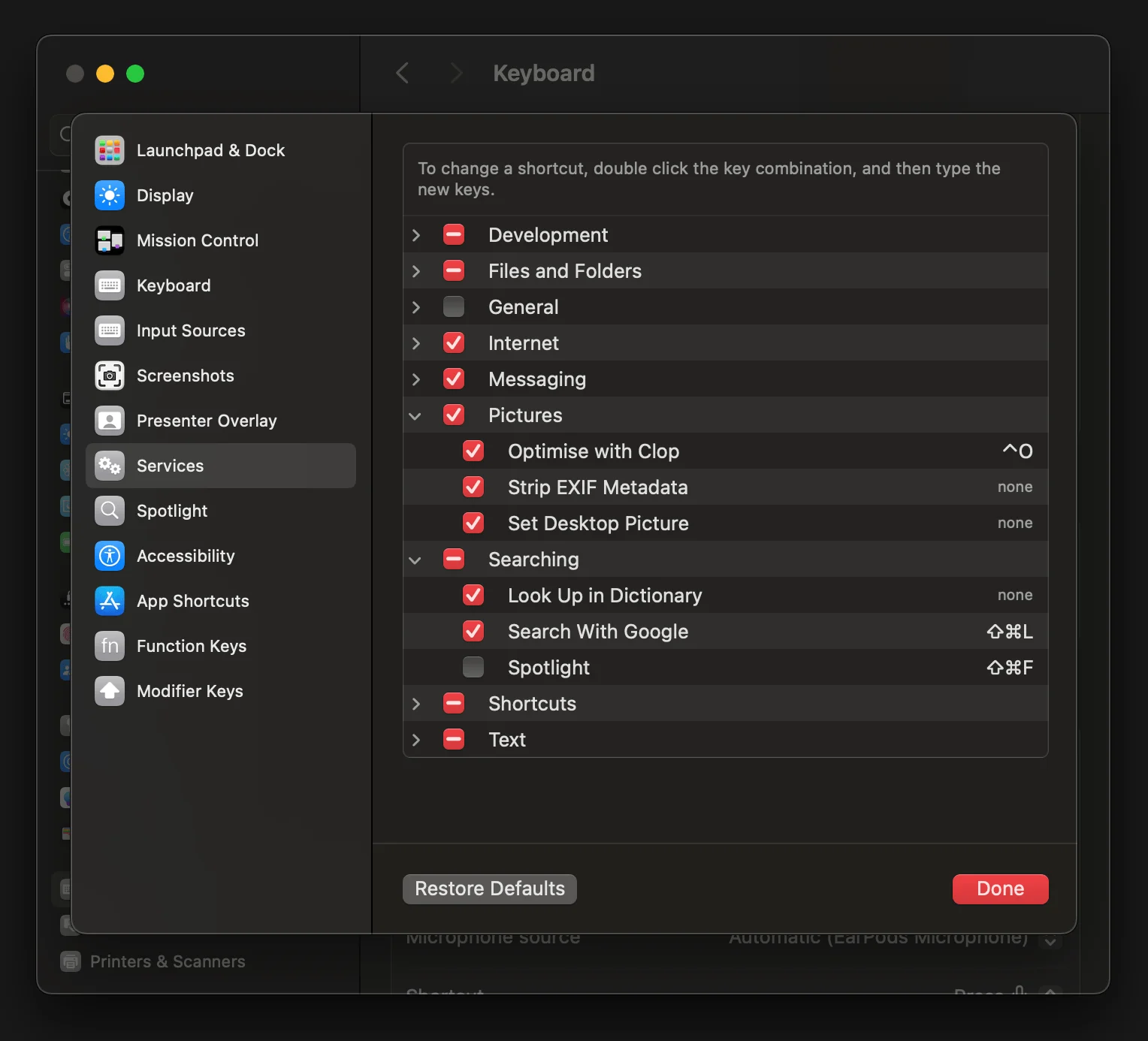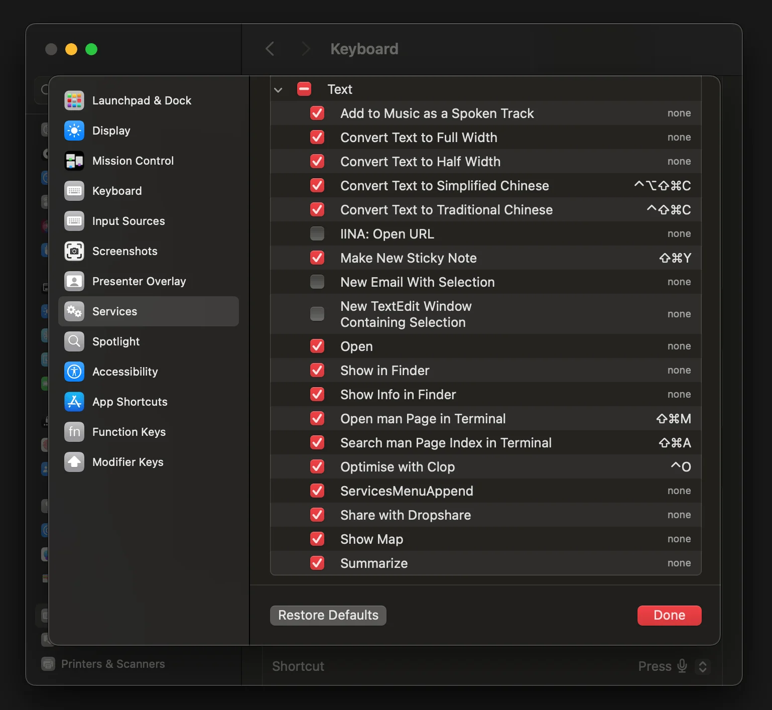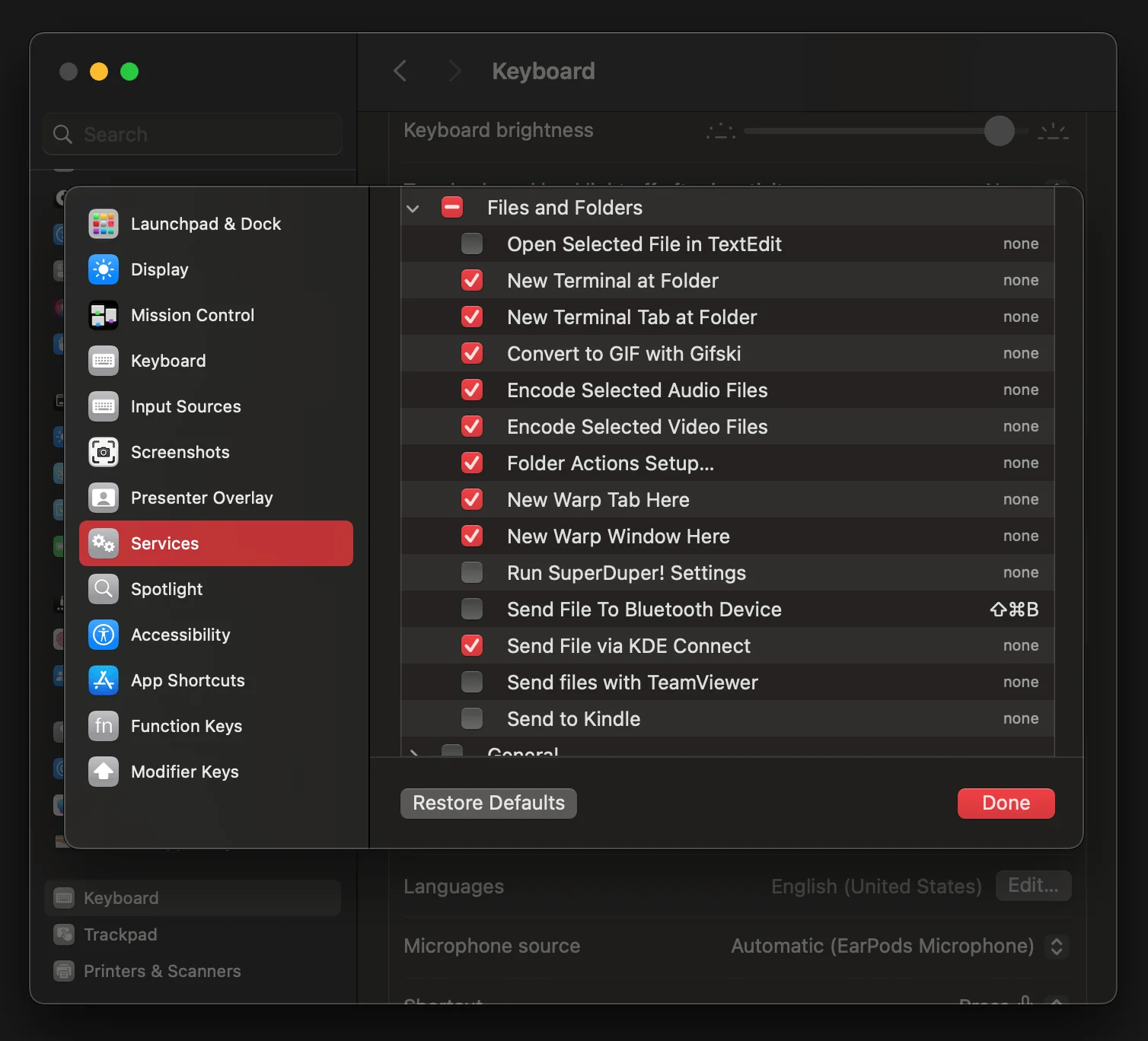 ⌘ + ⇧ + 5 to take a screenshot for a window, it auto adds a shadow around it. You can avoid it by pressing the ⌥ key before you click the Capture button.If you look at the services tab, you not only decide the keyboard shortcut for them, but also whether they show up or not. For example, for files and folders, you can turn on New Terminal at Folder as an example of inbuilt app, or Send File via KDE Connect as an example of installed app.