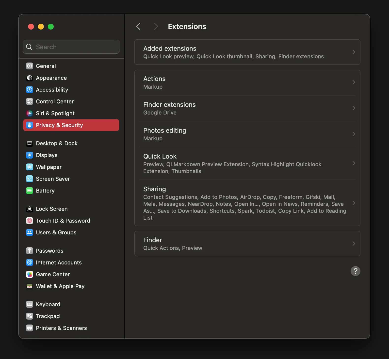 If you scroll down to Privacy and Security section, you will see extensions. Extensions add more options to your files.