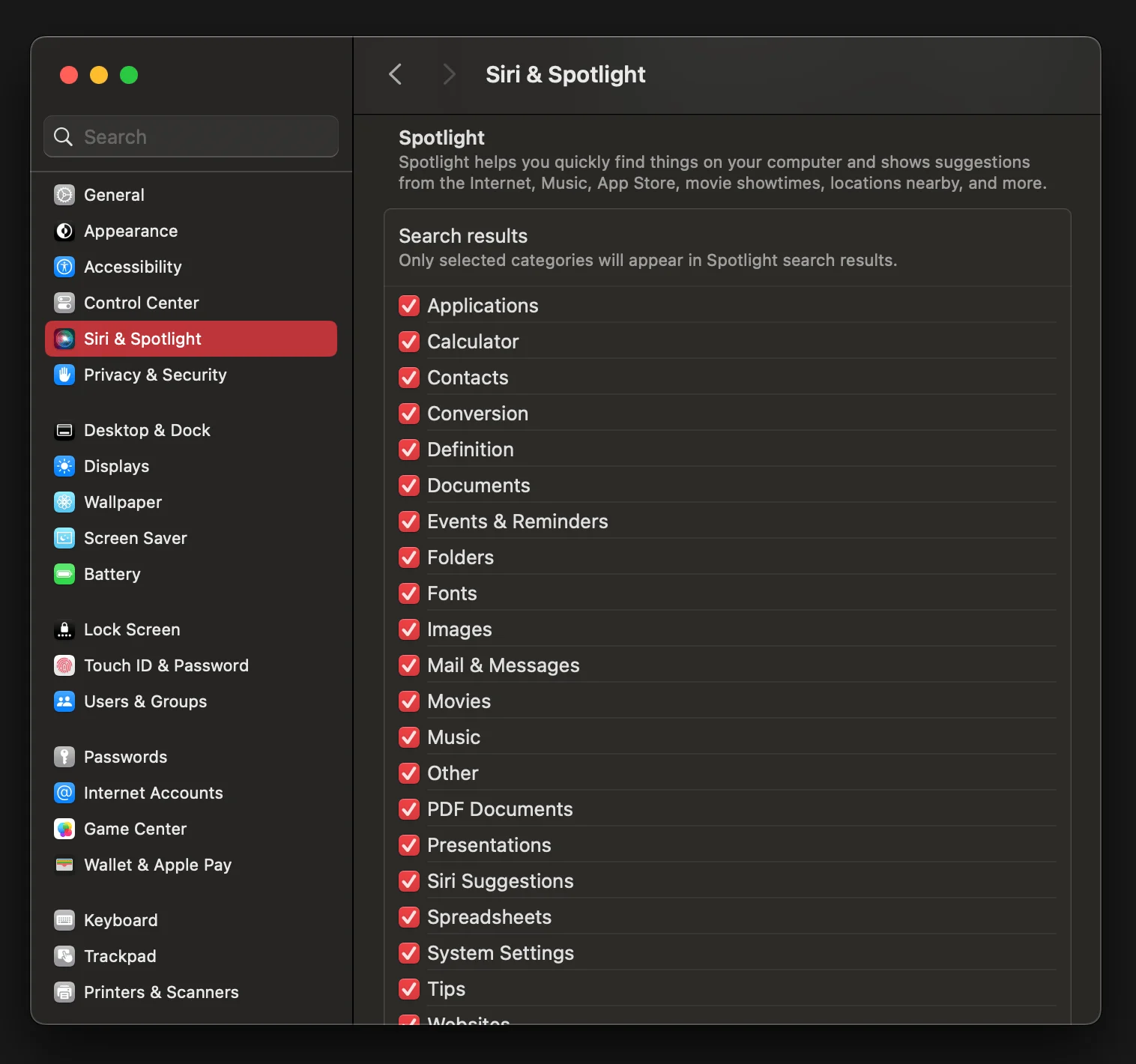 Spotlight search range. You can decide what kind of things you want to show up in Spotlight using Siri & Spotlight. For example, you can choose to exclude Fonts, because who, other than designers ever wants to string match with a font?