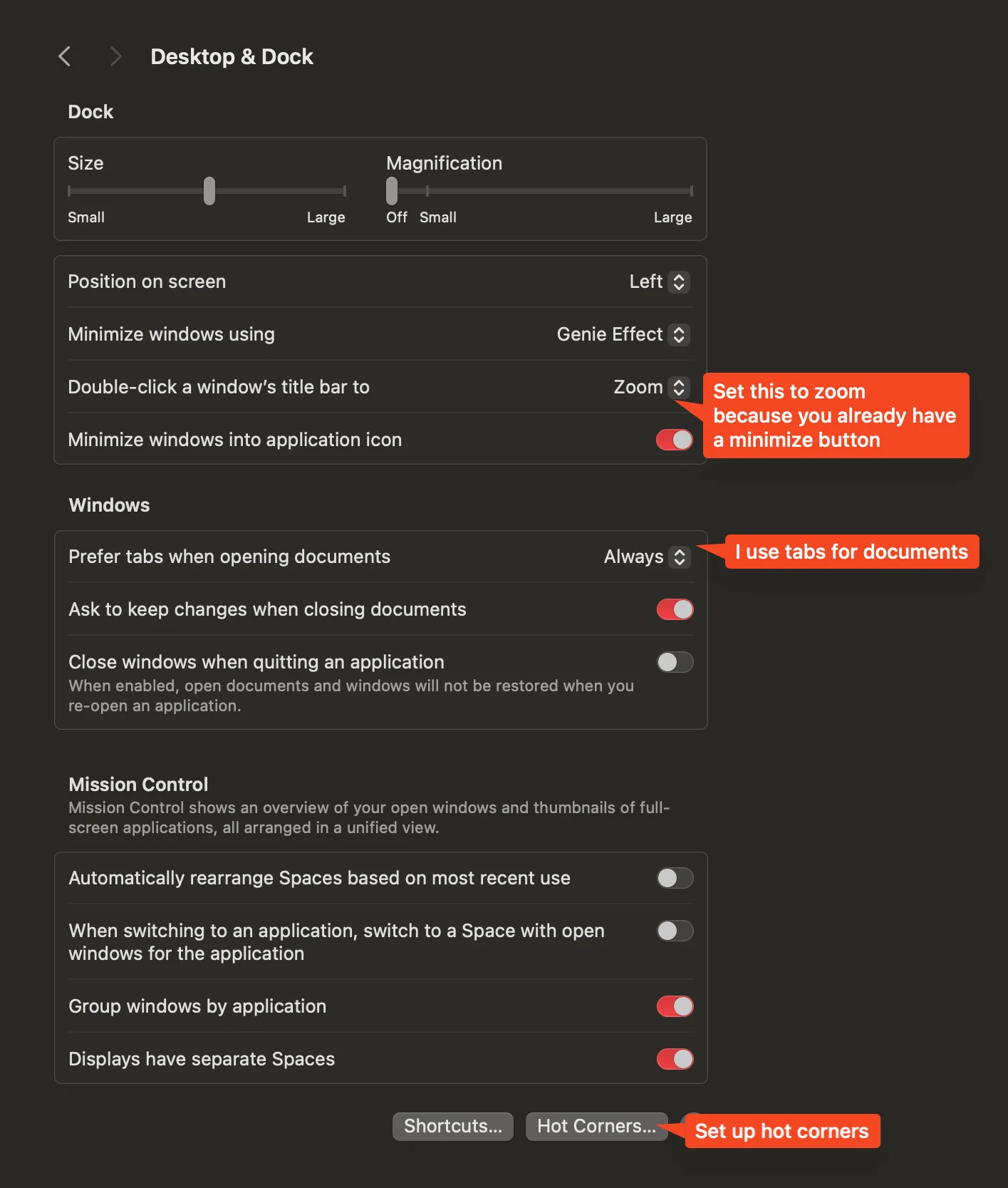 I usually set the double click on window title to zoom, use tabs for documents and set up hot corners, as the bottom right hot corner to open quick note. This is because I have dock on left, which triggered by moving the cursor to bottom left corner.