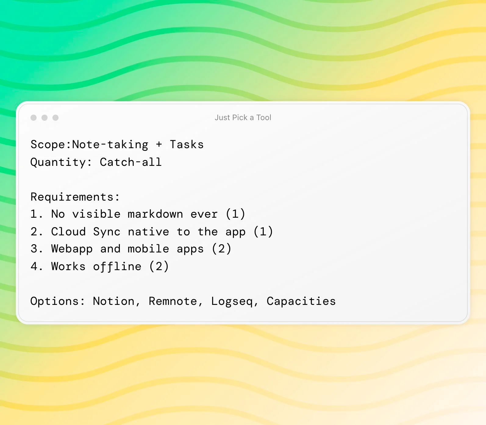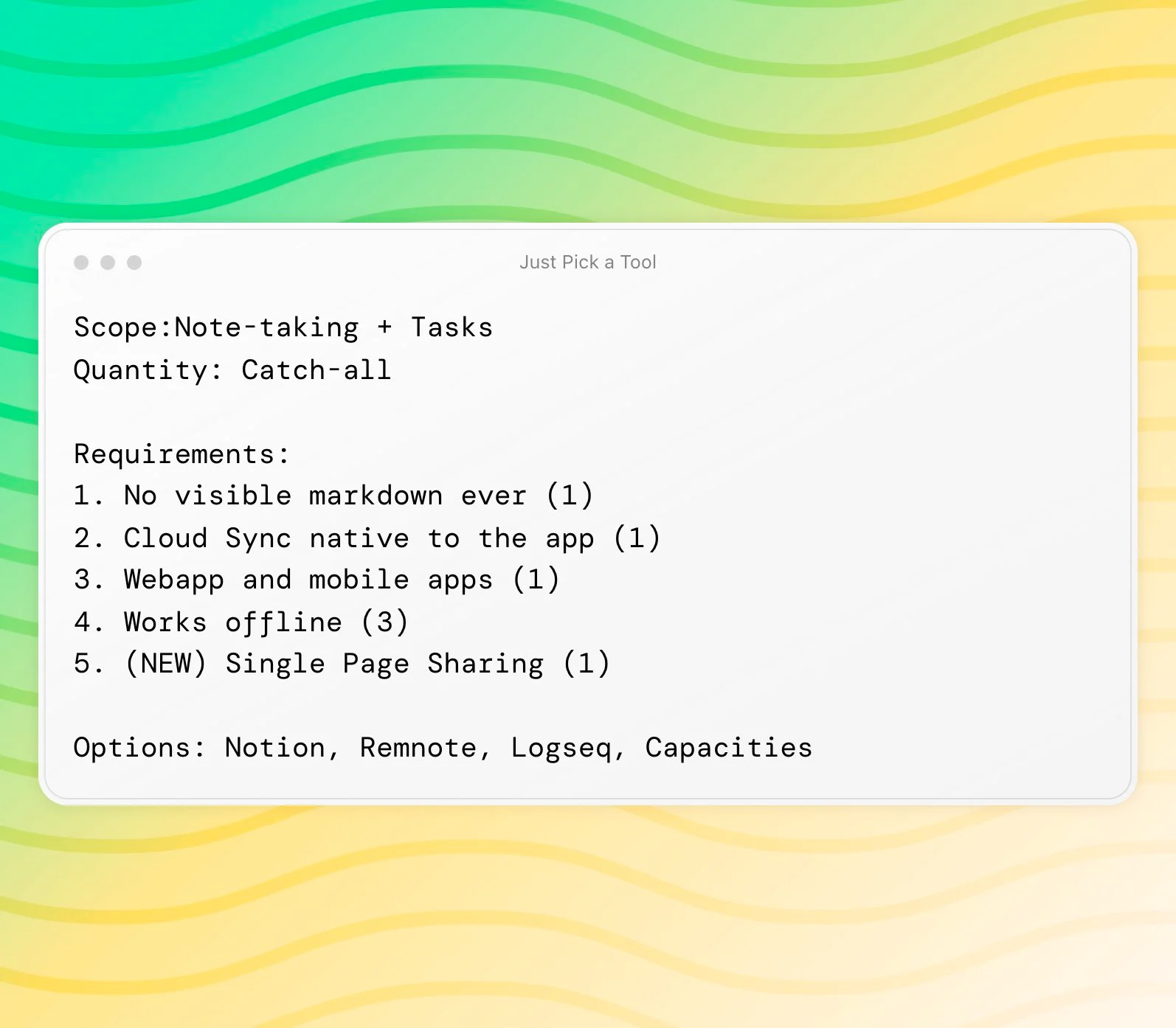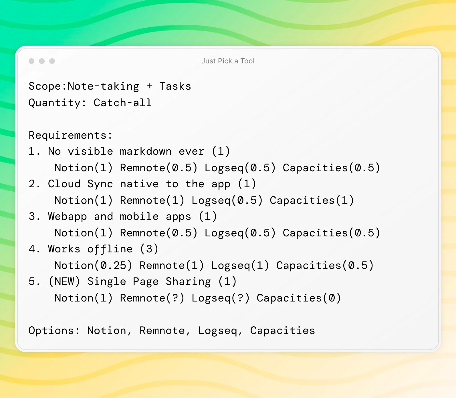 Let me give you an example of how this evaluation process works in practice. I discovered Capacities after already using Notion and Readwise for some time.