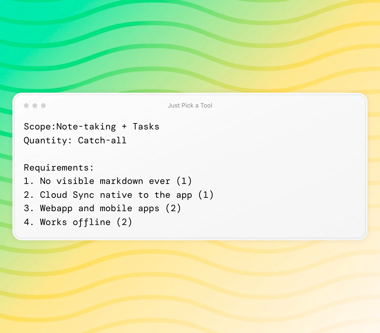 Now that we have that out of the way, let's dive into how I would suggest choosing a note-taking app. I'll provide examples throughout to illustrate my points.
