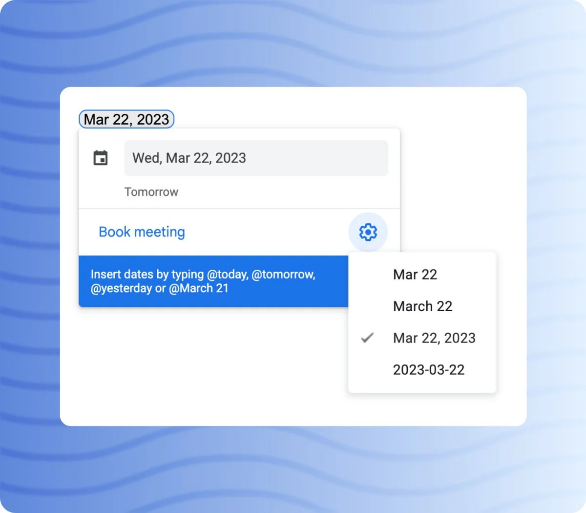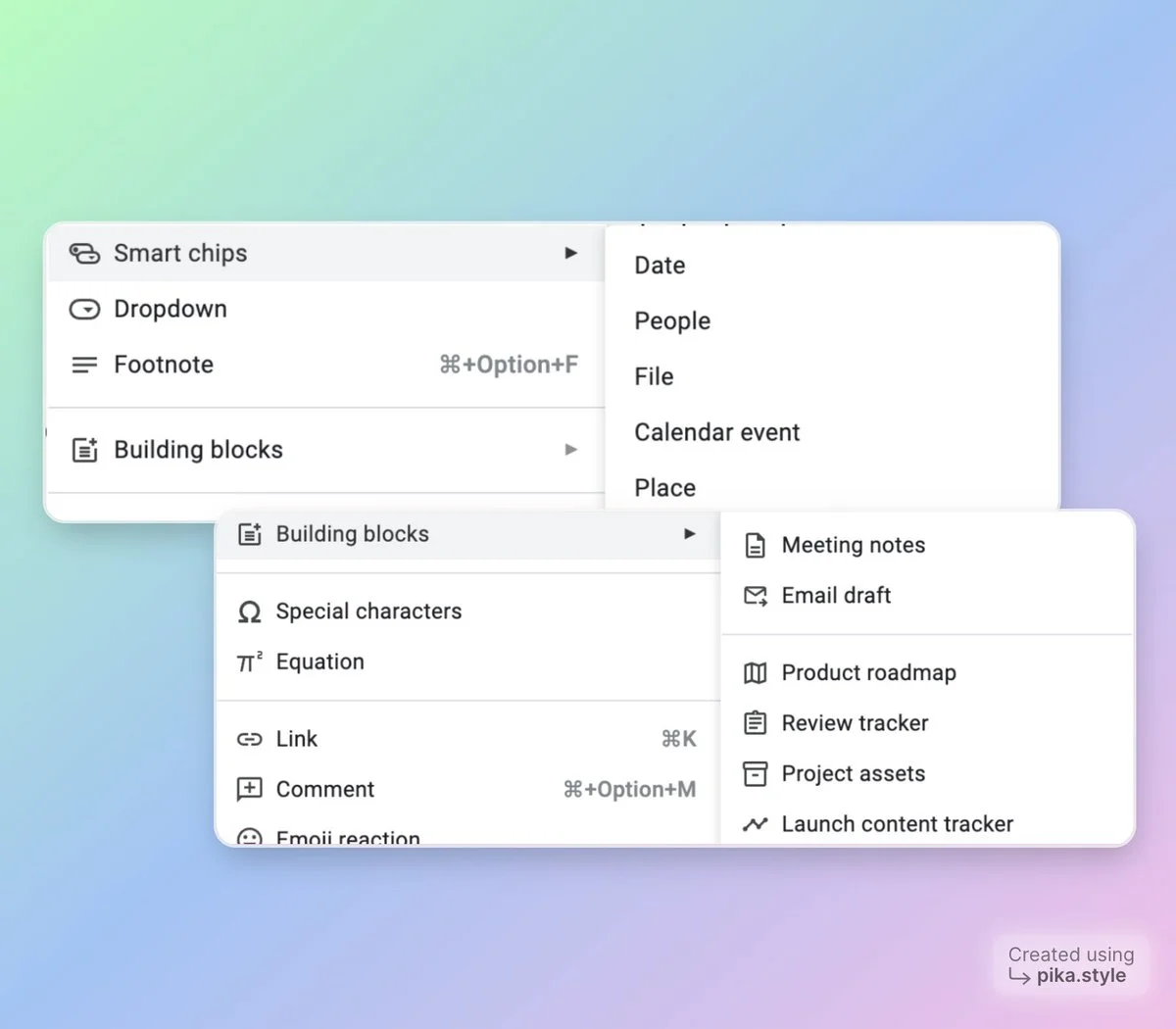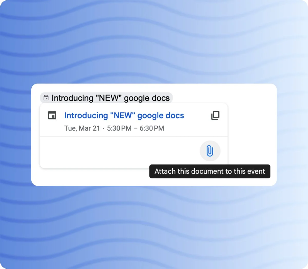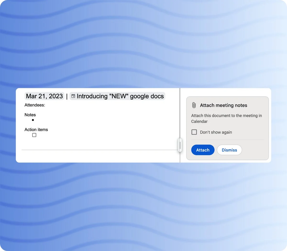 Another building block is meeting notes, which auto mentions the date, the document and creates a draft meeting note template right inside your doc when you select a calendar event.