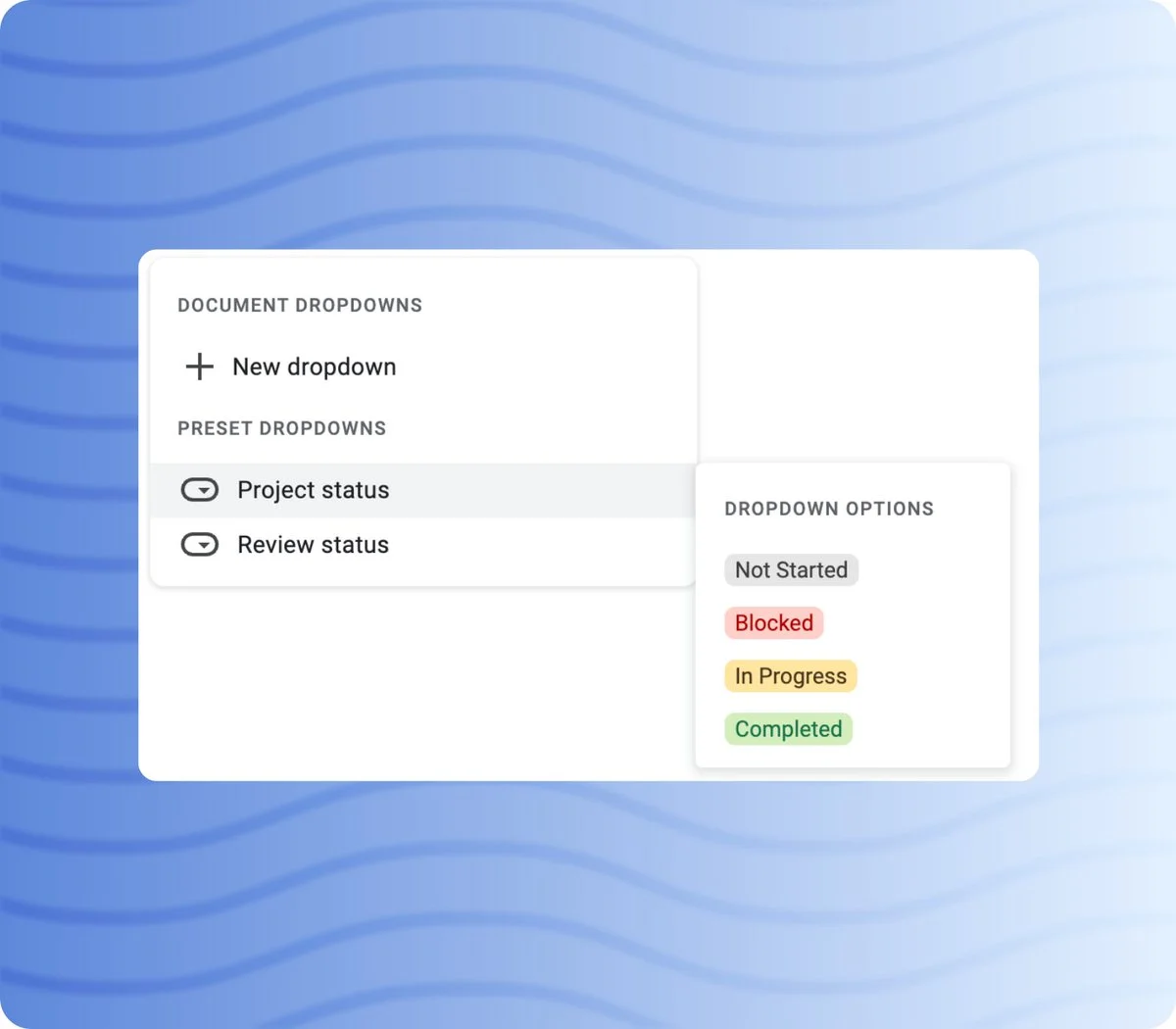 Create templated document dropdowns that you can use anywhere in the document. It comes with two that are preconfigured but you can configure one on your own.