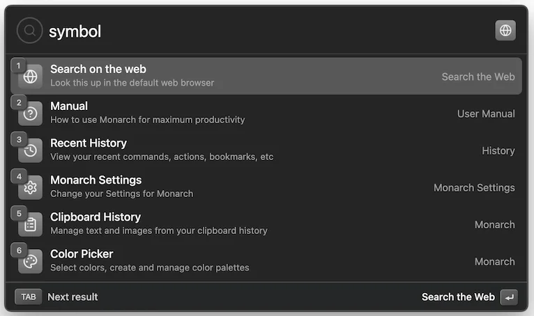 Sometimes, I just want to see the results in an iframe within the application. I'm not sure how difficult that is to implement in a macOS application, but that's my ideal user experience. I was curious if Monarch could do this, but unfortunately, when you type a term and click "search the web," it opens in the default web browser instead of showing results within the app. This is unlike some launchers on Linux (the names that I cannot recall at the moment), which display results in a pop-up, making it especially useful for looking up places on Google Maps, or searching for a term quickly for example.