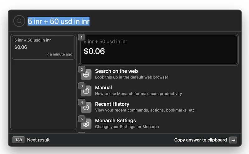 One of the first things I try with any launcher application is how well it handles unit conversions and similar tasks that I used to rely on Google for. Since I started using Raycast, I haven't needed Google for these tasks, and Monarch works pretty well with unit conversions.