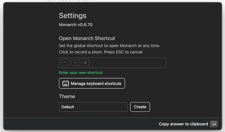 The first thing I wanted to do was change Monarch's shortcut. It was such a hassle with the cursor sometimes not working and the main instruction at the bottom not doing its job properly. I had to go into the settings, change it, and press enter to save it because initially, the enter key prompt kept getting stuck on copying the answer to the clipboard. I really didn't like that experience. You can change the shortcut and kind of change the theme, but you can't sync it to the system, at least not in the way I saw it. So, you always have this dark screen, dark theme pop up. I'm a fan of system-synced settings rather than dark themes, which might be influencing my opinion here.