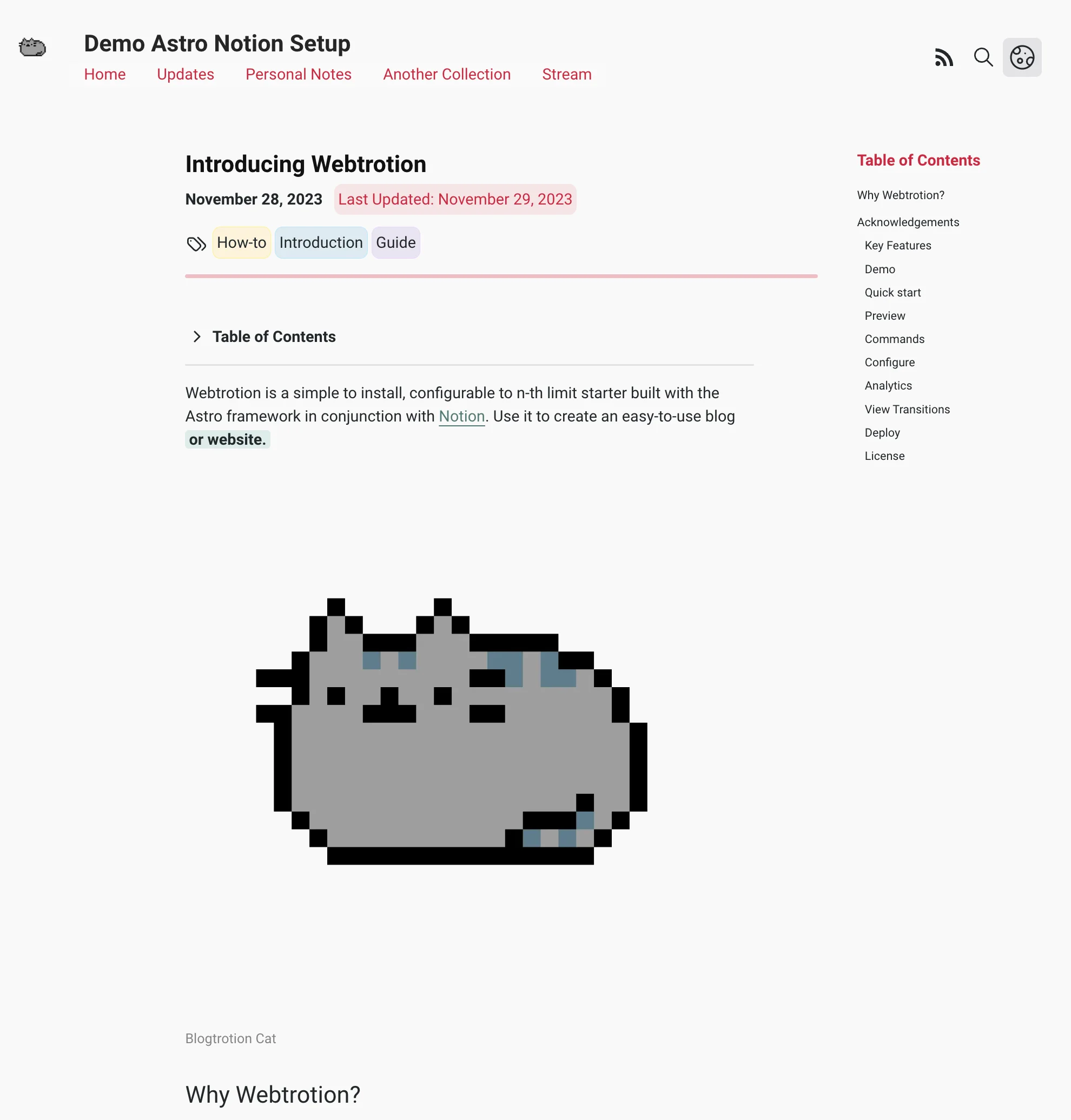Webtrotion is a extensively configurable, simple to install website builder, built with the Astro framework in conjunction with Notion. Use it to create an easy-to-use blog or website.