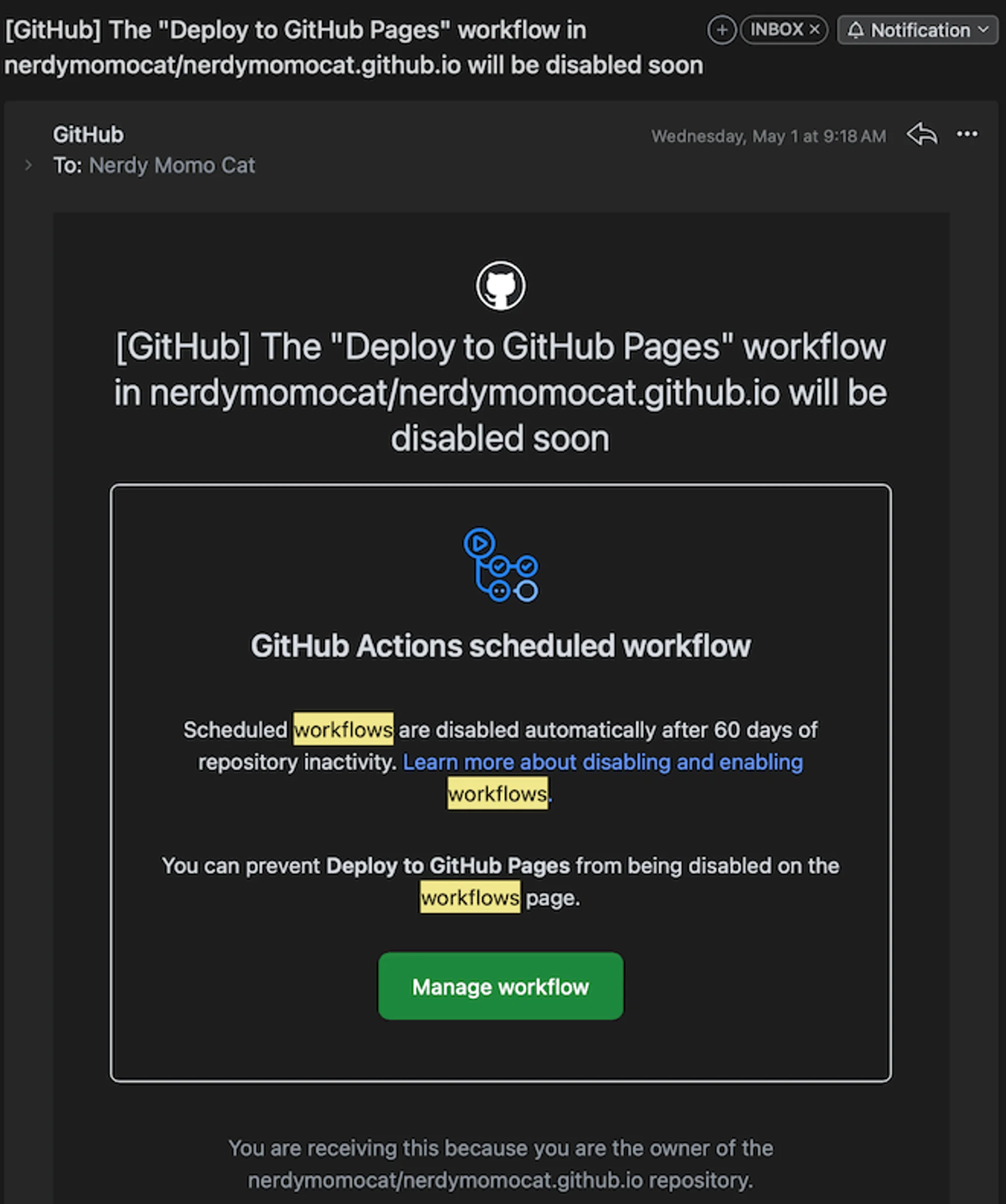 ![[GitHub] The "Deploy to GitHub Pages" workflow in nerdymomocat/nerdymomocat.github.io will be disabled soon](/_astro/Untitled.DAUOZvuN_Z12cVKp.webp)