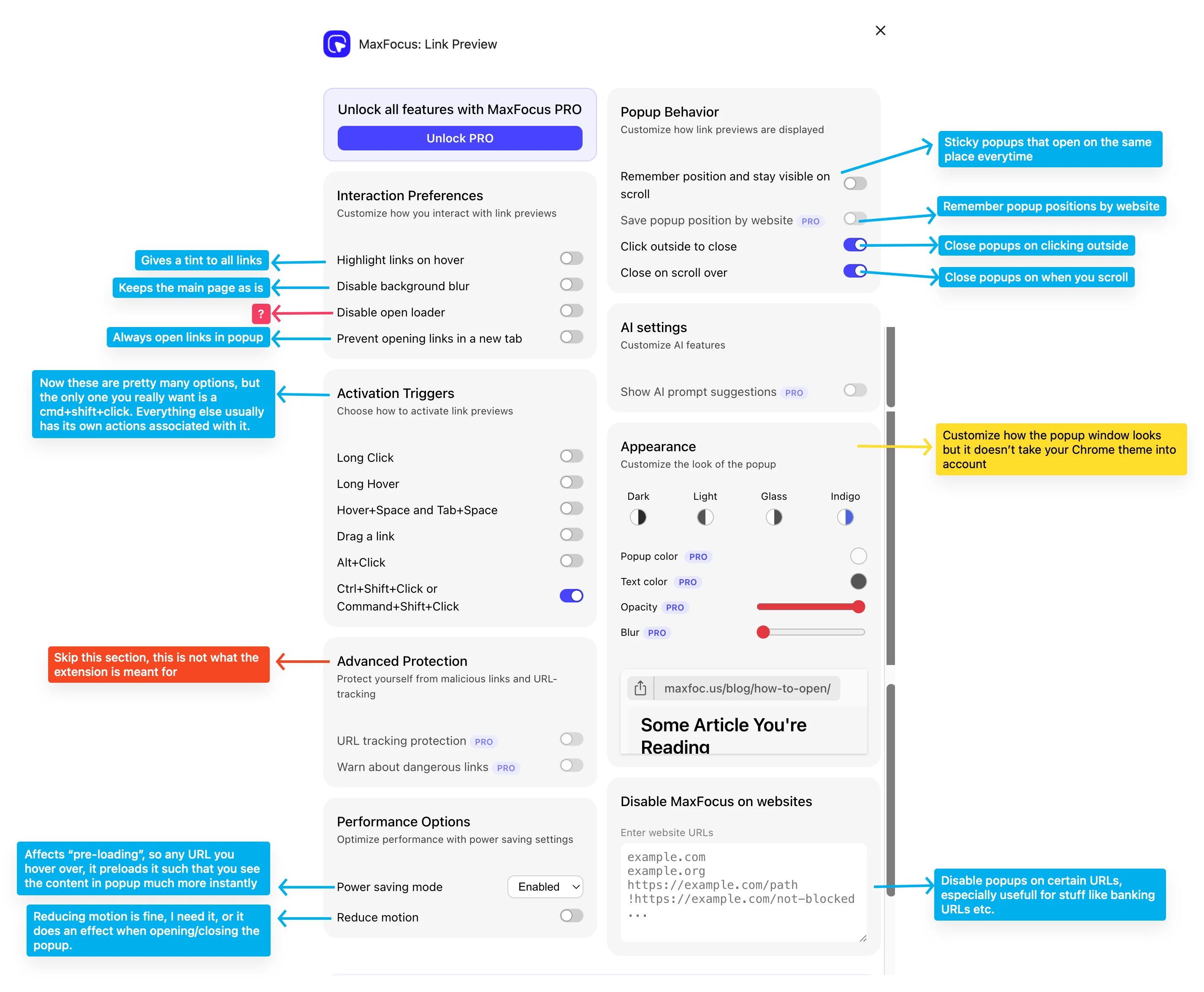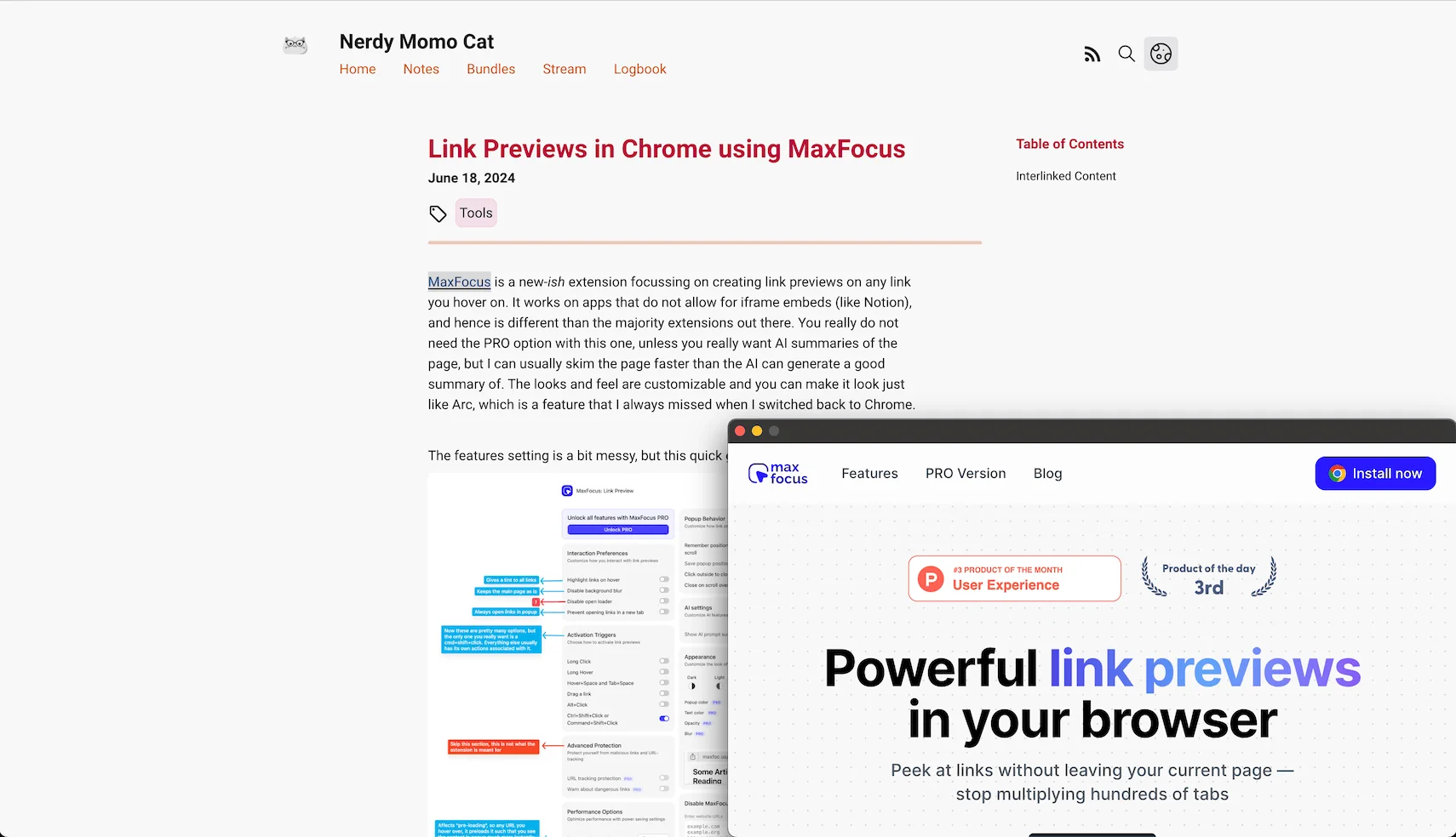 MaxFocus is a new-ish extension focussing on creating link previews on any link you hover on. It works on apps that do not allow for iframe embeds (like Notion), and hence is different than the majority extensions out there. You really do not need the PRO option with this one, unless you really want AI summaries of the page, but I can usually skim the page faster than the AI can generate a good summary of. The looks and feel are customizable and you can make it look just like Arc, which is a feature that I always missed when I switched back to Chrome.