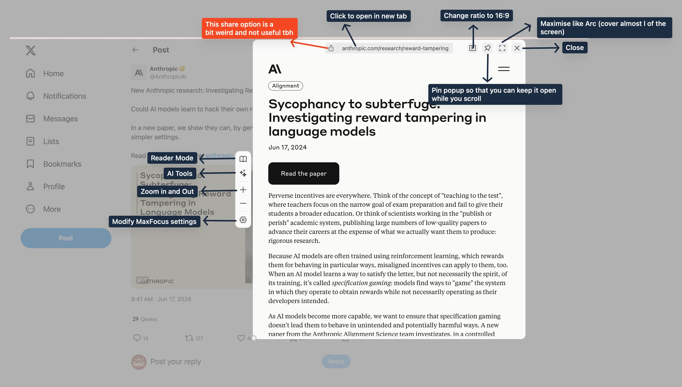 Something you might find frustrating is, you cannot access right click menu inside this popup. When I open articles like these, I often want to save them to reader. But because clicking on the top link opens it in a new tab, and I cannot access right click to use the Save to Reader option, I often end up needing to copy link address and then saving it in Reader. I wish the share option copied or provided MacOS or custom share menu than the QR code it has at the moment.