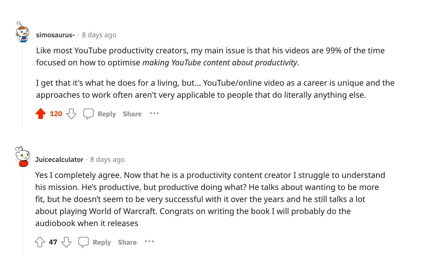 Juicecalculator says - Yes I completely agree. Now that he is a productivity content creator I struggle to understand his mission. He’s productive, but productive doing what? He talks about wanting to be more fit, but he doesn’t seem to be very successful with it over the years and he still talks a lot about playing World of Warcraft. Congrats on writing the book I will probably do the audiobook when it releases