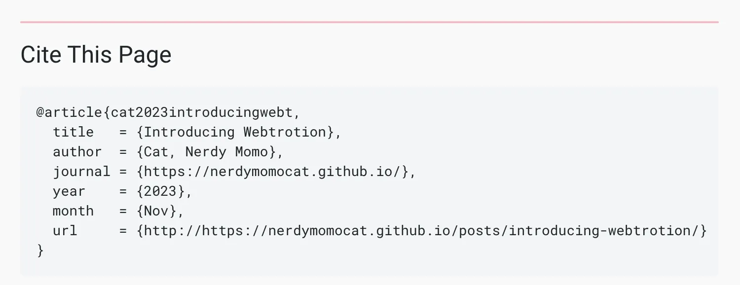 Set add-cite-this-post-section to true if you want Webtrotion to automatically add a "Cite this page" section at the end of each page. This generates a pre-formatted BibTeX entry for the page itself, making it easy for readers to cite your work in their own papers or bibliographies.
