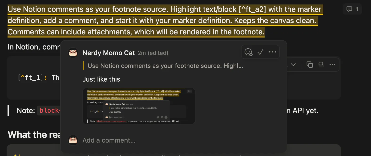 [f], add a comment, and start it with your marker definition. Comments can include attachments, which will be rendered in the footnote.We need this because Notion API only returns block ids, not the text span that was commented on. When that is fixed, I’ll implementblock-inline-text-comments.ℹ️Note: The above will not be rendered because my config is set toend-of-block.