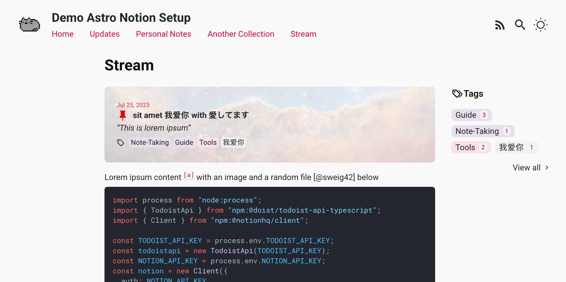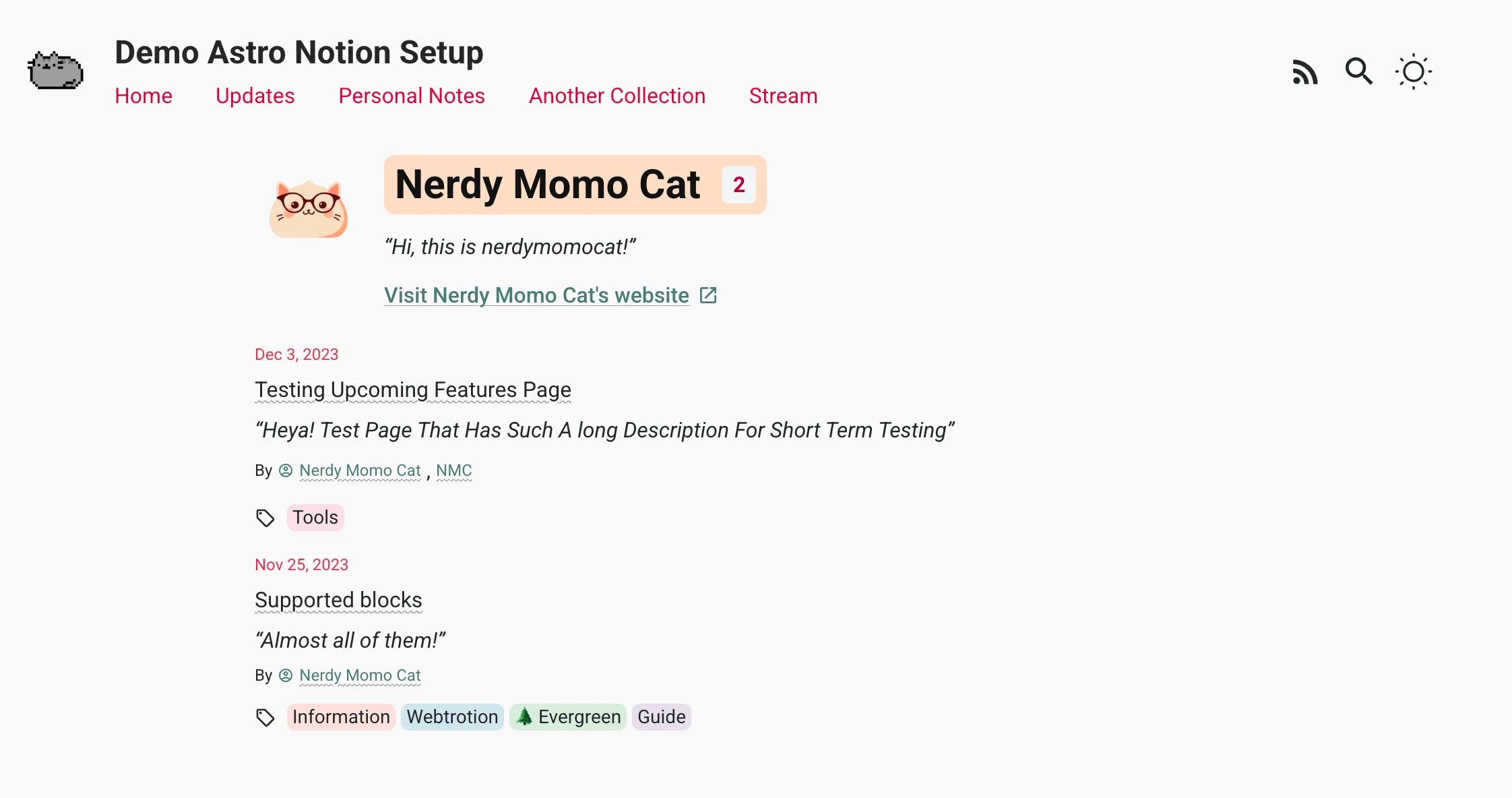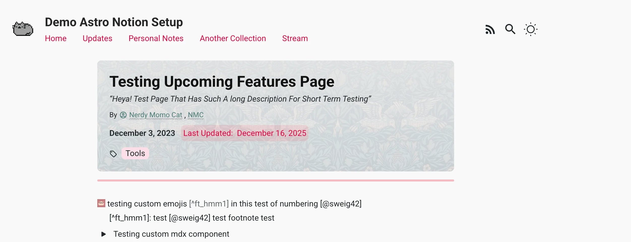Even when a post is 100% external, Notion is the source of truth for title, excerpt, author (from your Notion page title/fields), tags and collections (so listing filters, pinned posts, and RSS feed keep working), and publish date plus updated date (so Last Updated hero blocks tell the truth), which means you can mix and match however you want. Write a short intro in Notion, flip the "External URL" to a GitHub folder, and the page glues them together, or keep Notion blank and let the external Markdown [d]