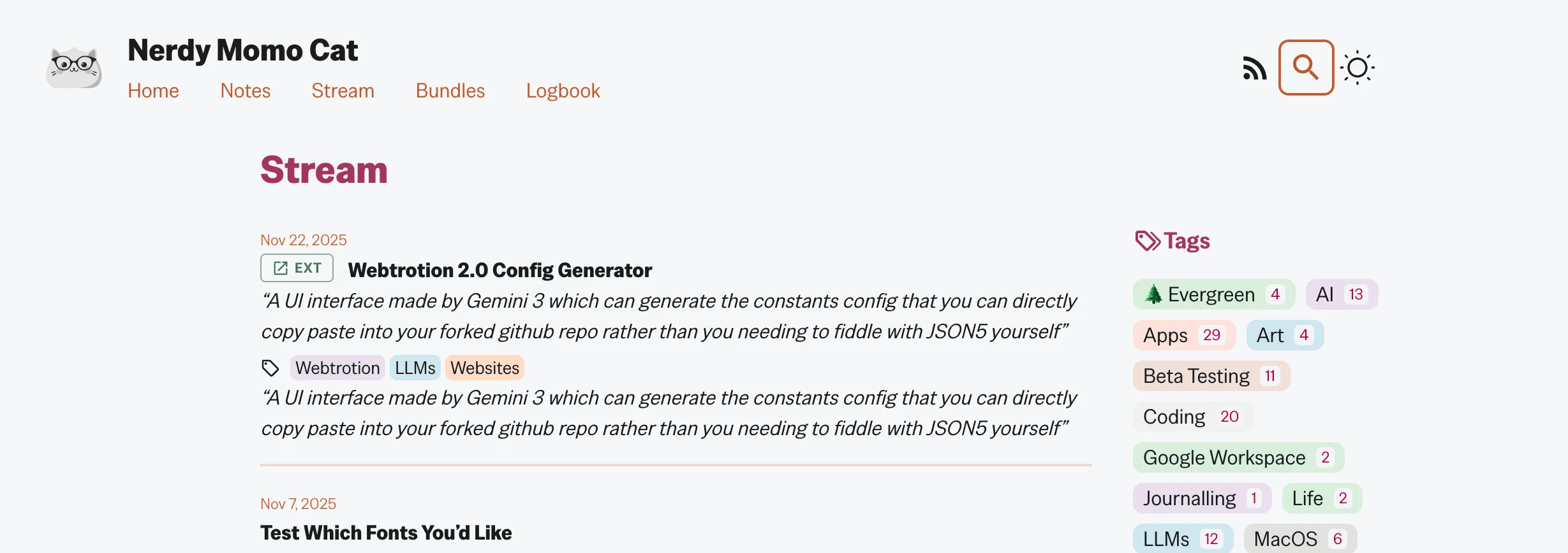 I added a theme → preset variable in the config but it doesn't do anything yet. Planning to actually ship theme presets in 2026, right now I'm thinking Scholar (clean, academic, serif-heavy with good typography for long-form reading), Neon Techno (dark backgrounds, bright accent colors, that cyberpunk aesthetic), Pastel/Barbie (soft pinks and purples, rounded corners, very 2024), Playful (squiggles, hand-drawn borders, asymmetric layouts), and New Brutalist (raw, minimal, high contrast, no bullshit).