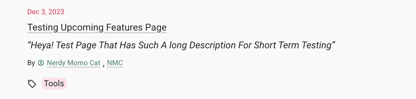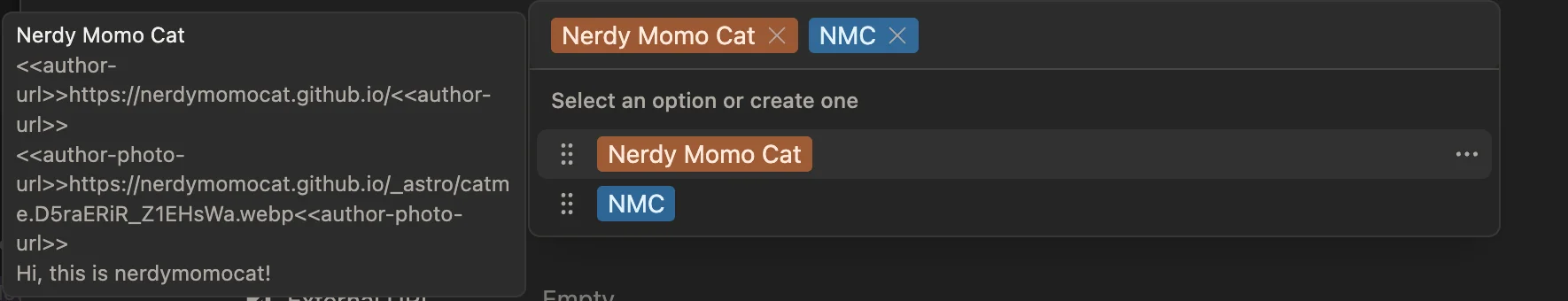 I also considered using a rich text property where people could just type names and color/link them however they want, but then I'd have to parse arbitrary text to extract author names, and building individual author pages from that would be a nightmare because how do you even tell where one author name ends and another begins if someone decides to get creative with their formatting.