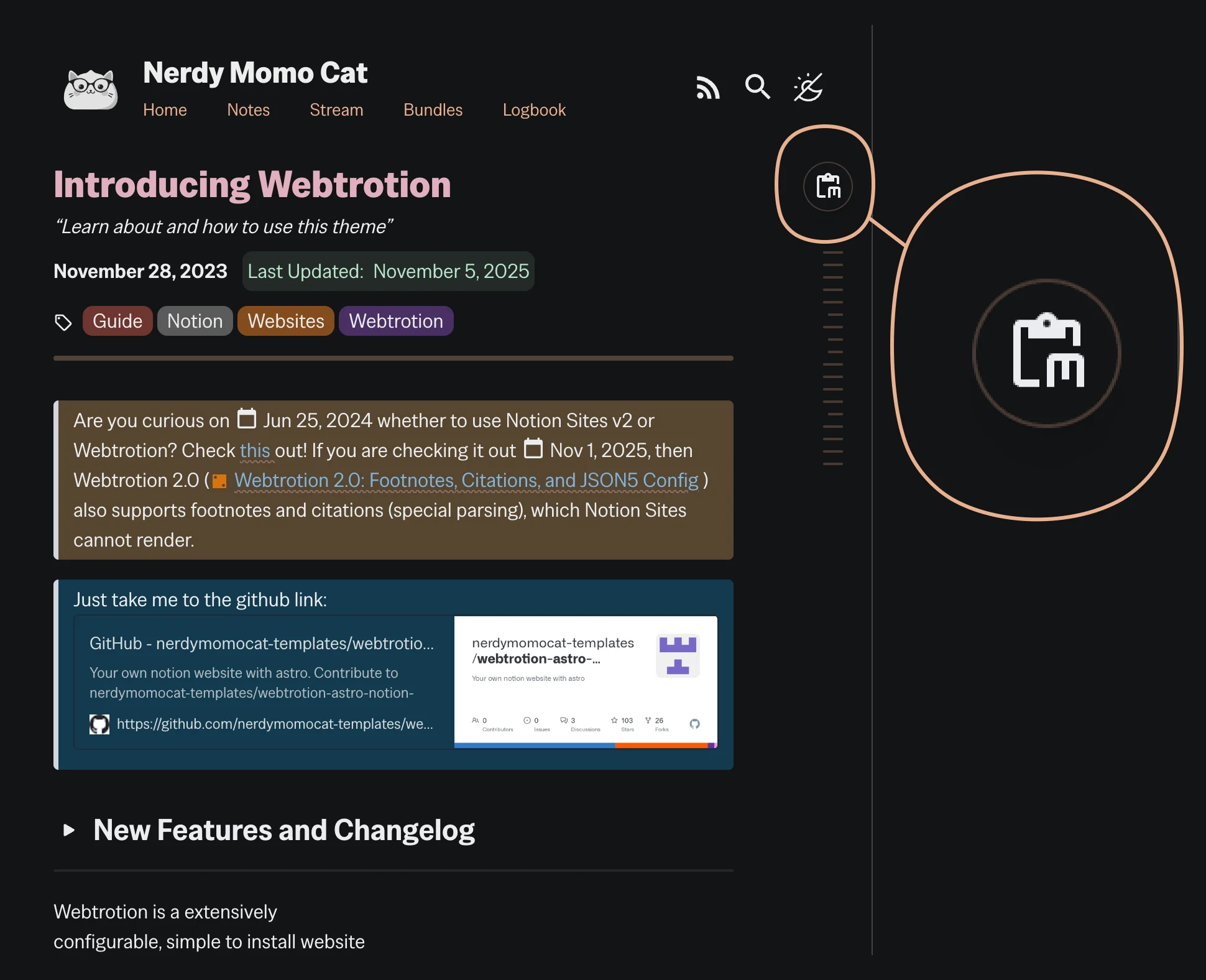 Markdown posts get parsed by the same block builder Notion uses, and I try to convert them as closely as possible to Notion block format. Callouts, toggles, tables, inline code, even the shortcode triggers like <!DOCTYPE html> <!-- inject --> behave exactly like their Notion equivalents, and footnotes, citations, interlinked sections are all extracted the same way, so the page still gets margin notes, backlinks, cite-this sections if you configured them.
