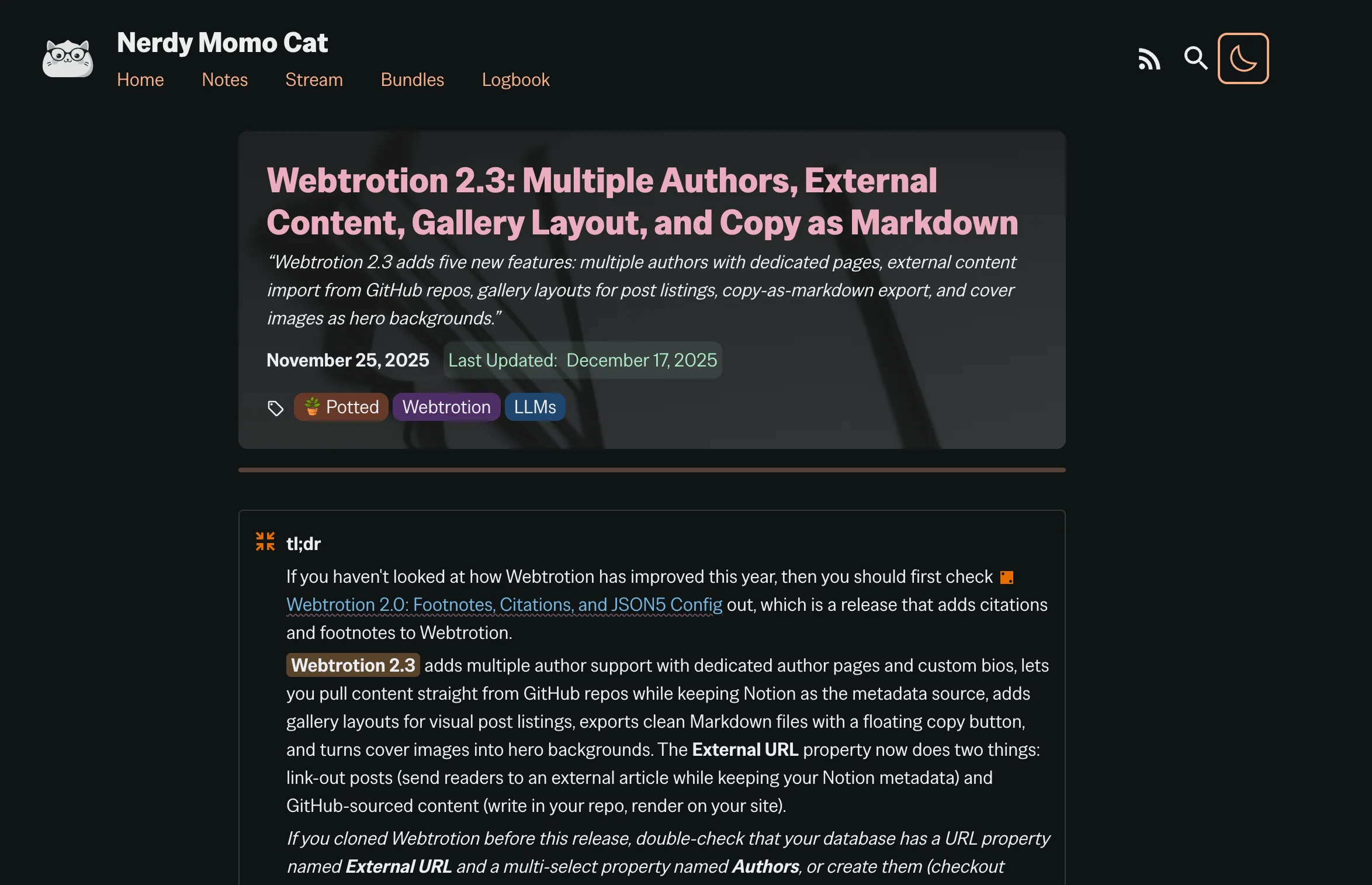 I spent the past four weeks with LLM coding assistants shipping five new features, mostly because I finally sat down and decided to just get them done. Multiple author support is something I wanted for potential guest posts and collaborative blogs down the line, external content (especially custom components) from GitHub was something I wanted for my own playable interfaces (like LLM chat components), gallery layouts make visual content work better (and hopefully is used by someone), copy as markdown is for the LLM era where I'm pasting posts into Claude and ChatGPT all the time anyway, and cover backgrounds finally make those Notion cover images do something useful instead of just sitting there being read in Webtrotion but never used.